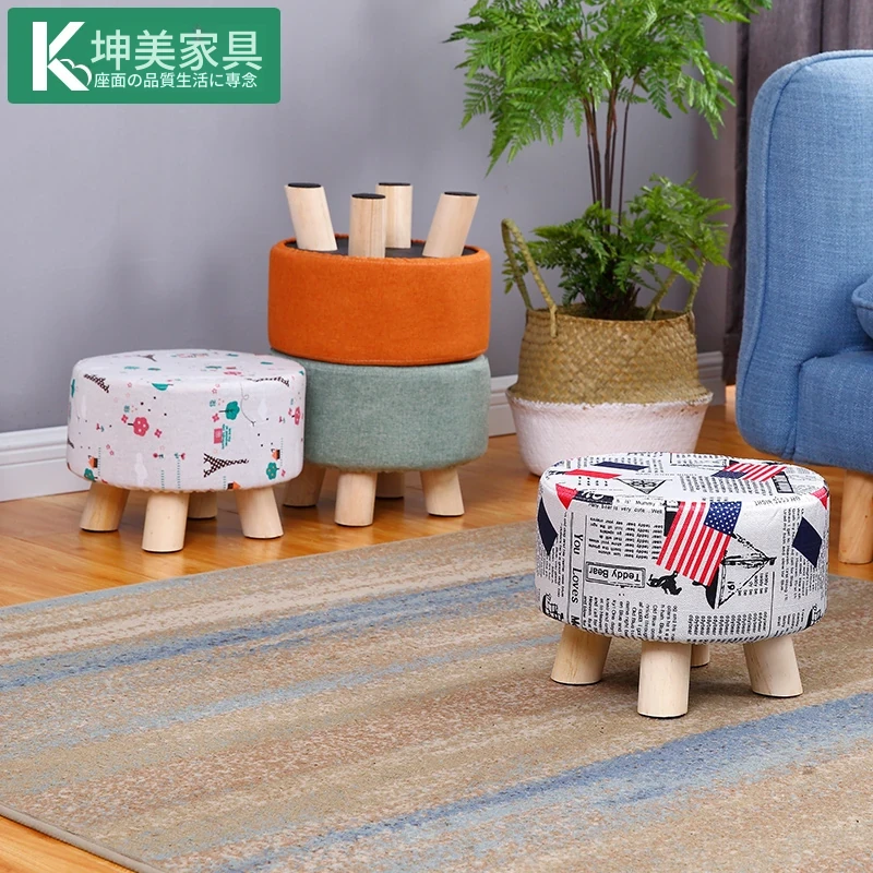 おしゃれな布製小スツール|実木使用のコンパクトなデザイン|ソファや玄関で大活躍!|人気の丸型スツール|リビングにぴったりな小さなベンチ|快適さとスタイルを両立!