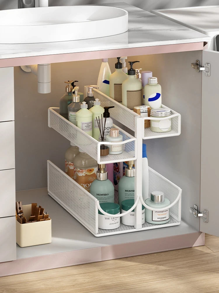 キッチンシンク下収納ラック・バスルーム洗面台引き出し式棚・調味料整理に最適な多層収納ラック!スペースを有効活用し、おしゃれで機能的なキッチン&バスルームを実現!