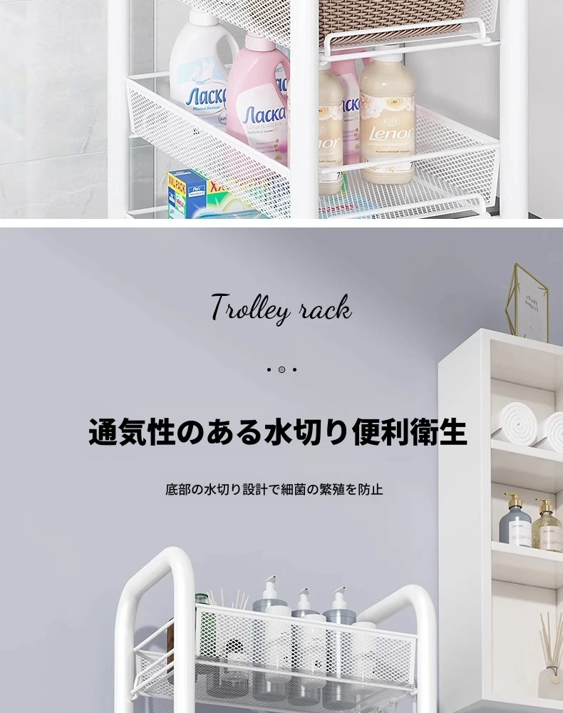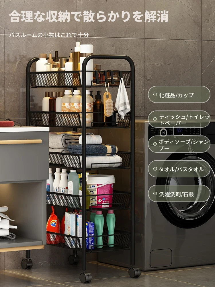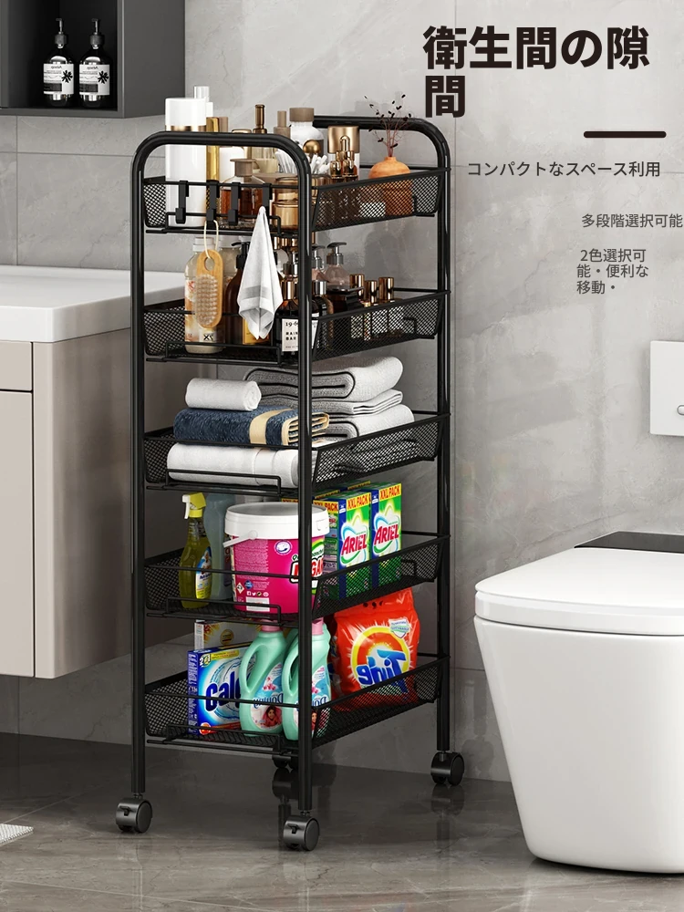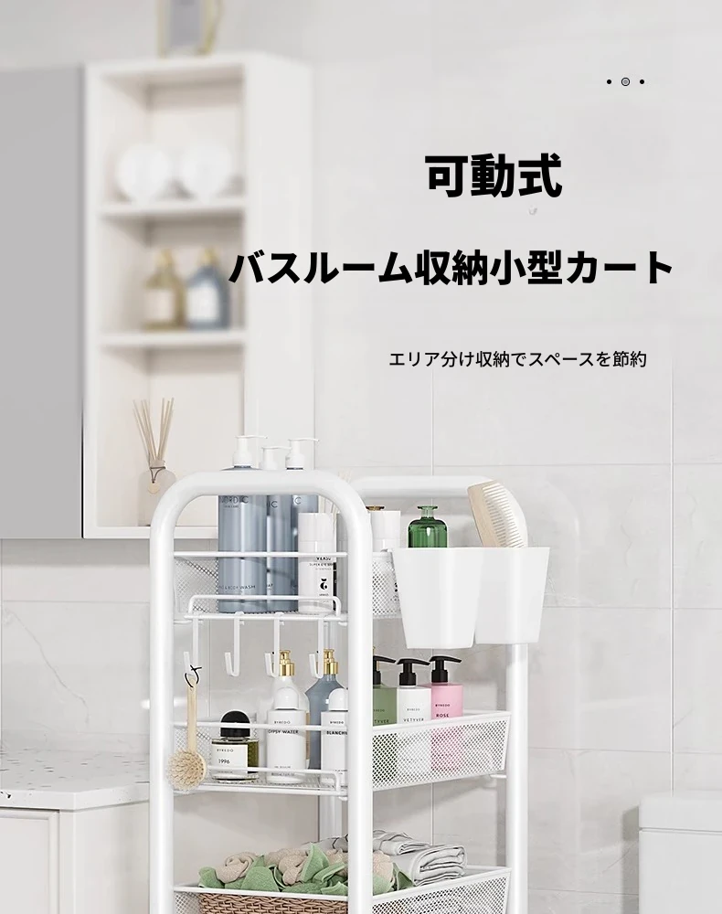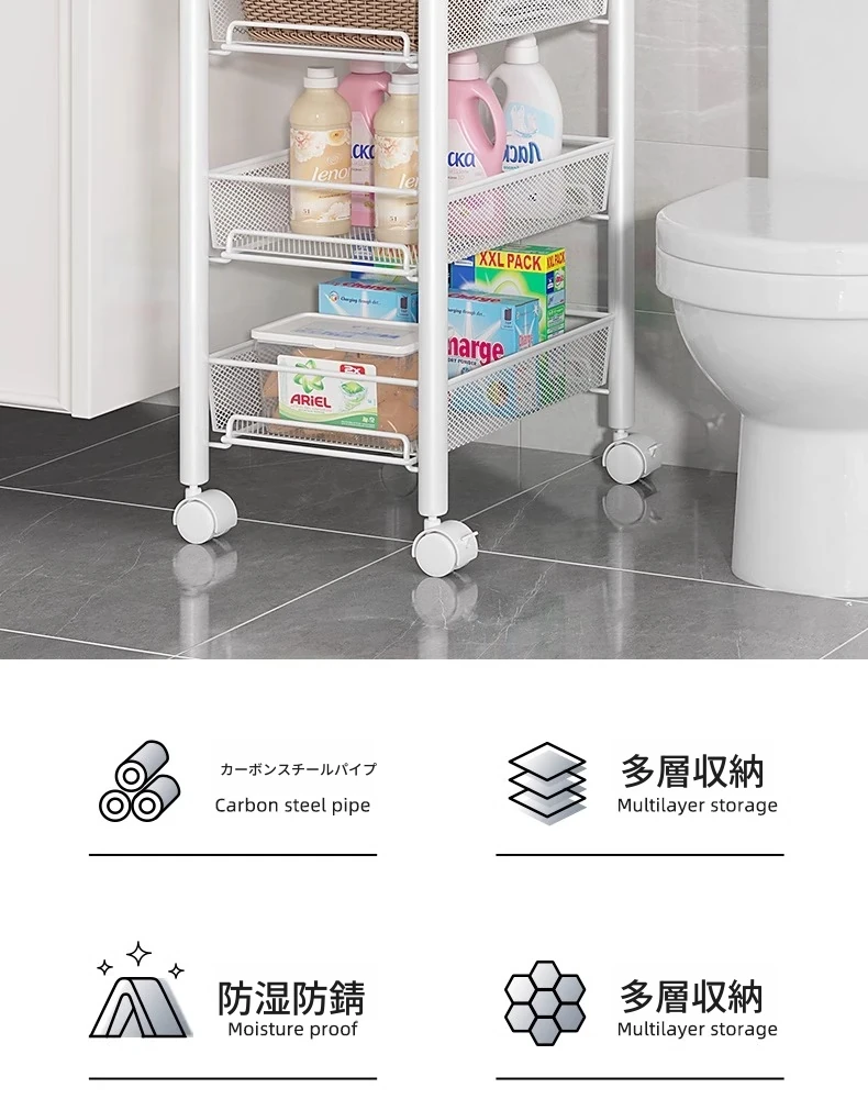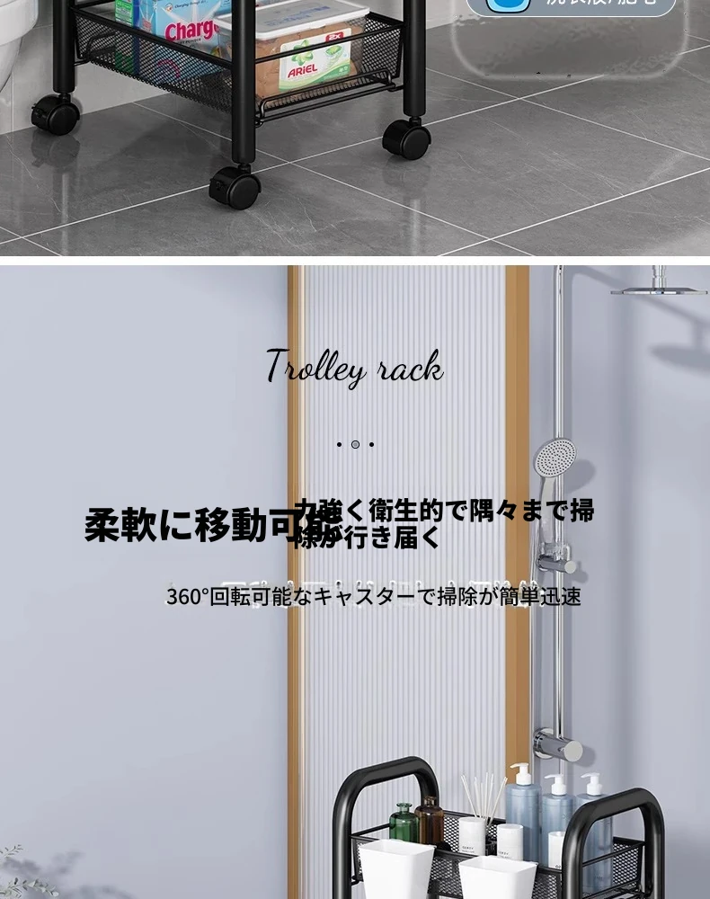 バスルーム用多層収納ラック - 移動可能な小型カートで、シャンプーやボディーソープもすっきり収納!機能的でスタイリッシュなトイレ収納棚。お風呂場をスッキリ整理して、快適なバスタイムを楽しもう!