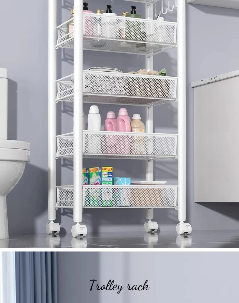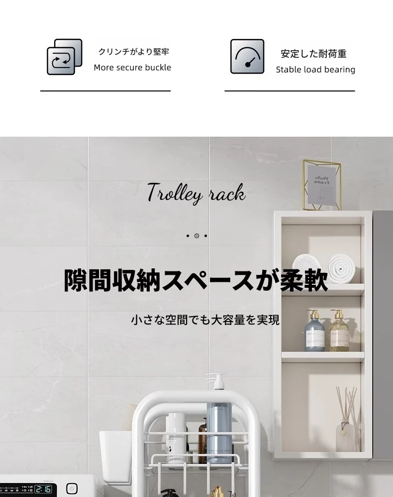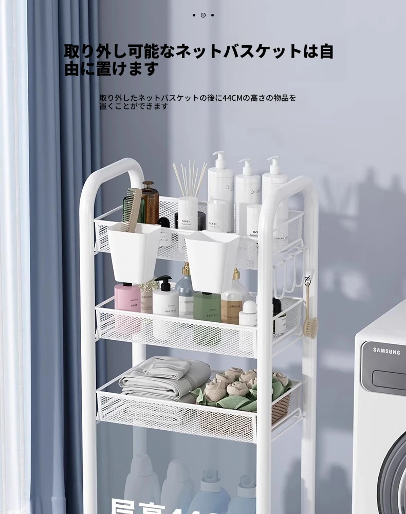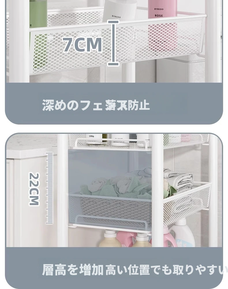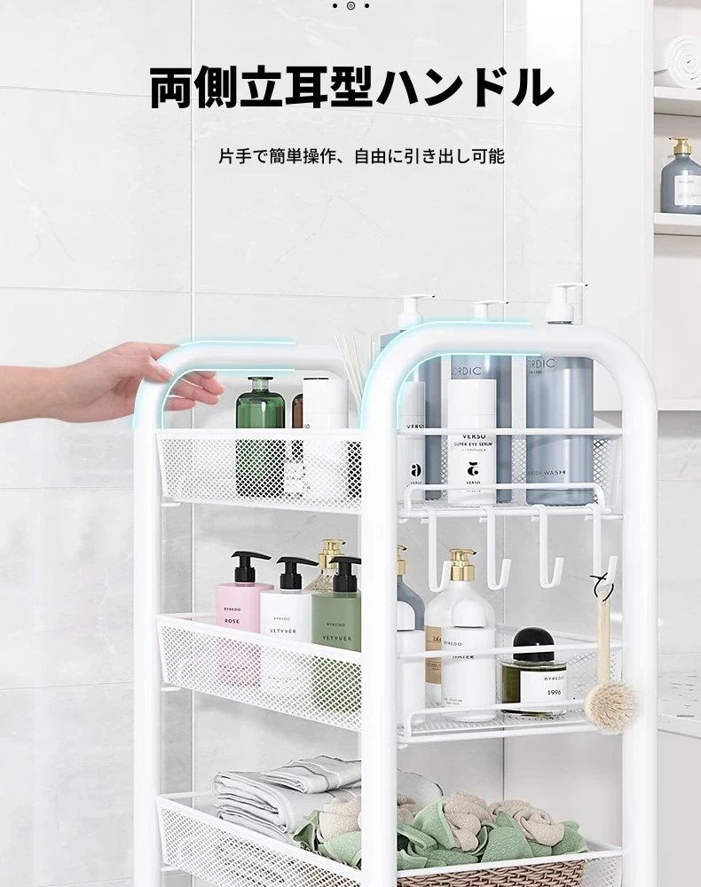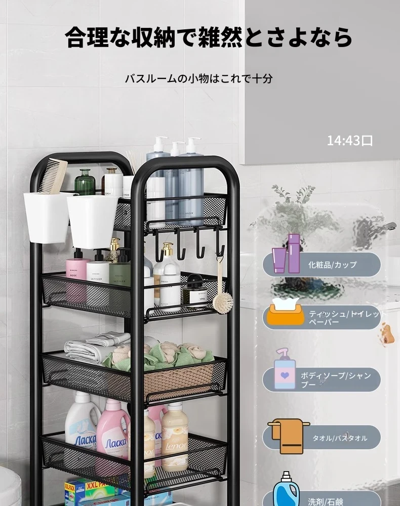 バスルーム用多層収納ラック - 移動可能な小型カートで、シャンプーやボディーソープもすっきり収納!機能的でスタイリッシュなトイレ収納棚。お風呂場をスッキリ整理して、快適なバスタイムを楽しもう!